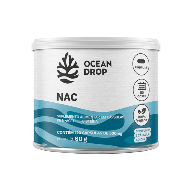 A N‑Acetilcisteína (NAC) da Ocean Drop é um suplemento alimentar à base de N‑acetil L‑cisteína, precursor da glutationa, o antioxidante mais importante do corpo. Cada porção (2 cápsulas) totaliza 1.000 mg de NAC, com 600 mg de cisteína disponível. O NAC auxilia na neutralização de radicais livres, proteção celular, suporte à função hepática, à imunidade e à saúde respiratória.