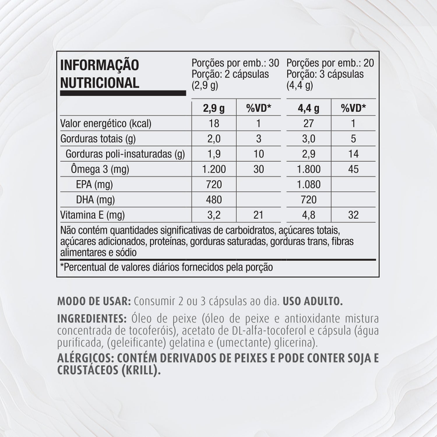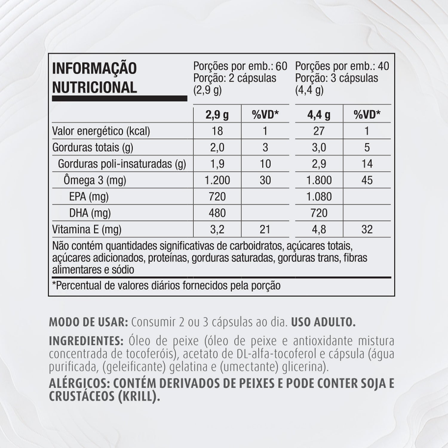 Óleo de peixe (Ômega 3) e DL-alfa-tocoferol. Cápsulas: Água purificada, (gelificante) gelatina e (umectante) glicerina.