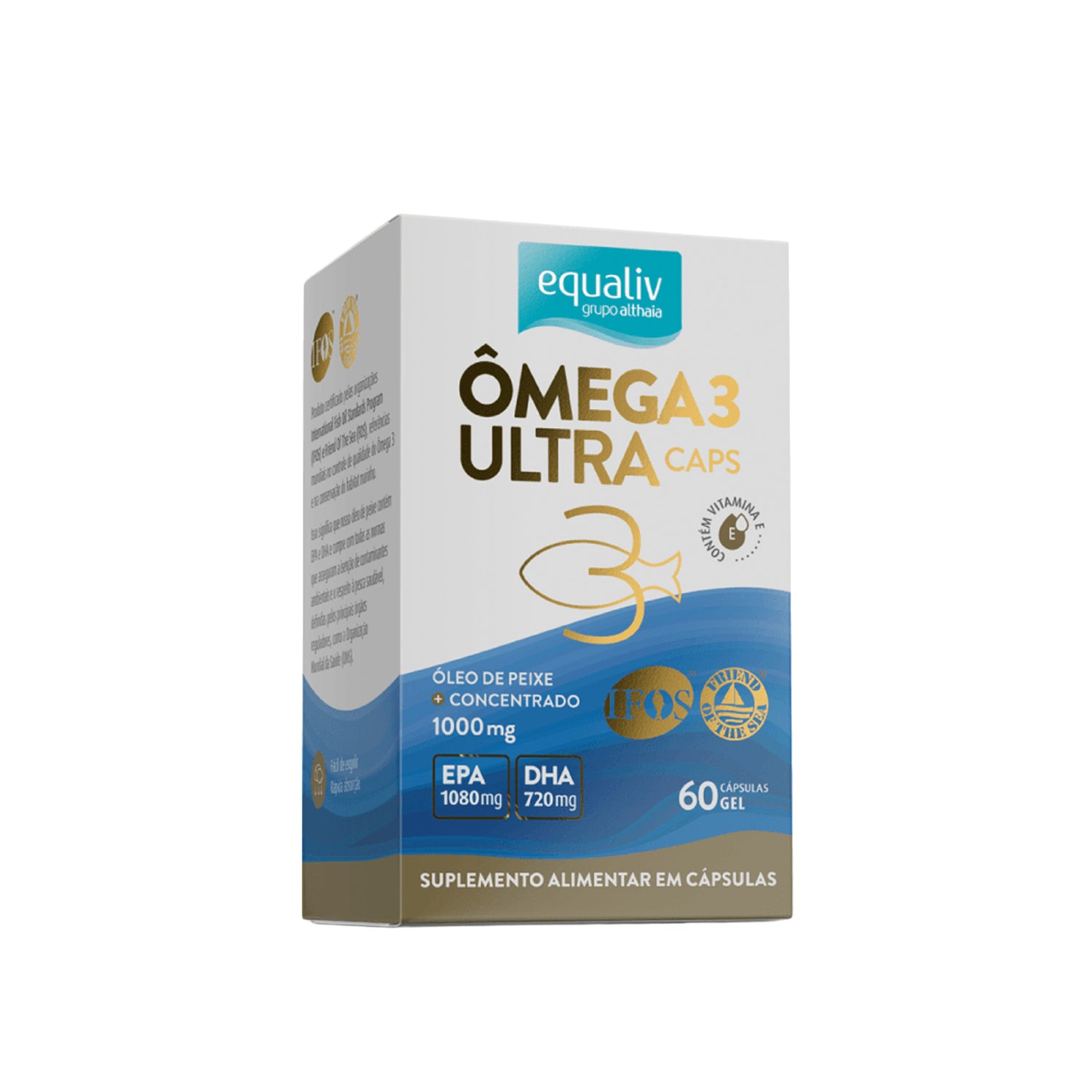 Equaliv Ômega 3 Ultra Caps é um suplemento à base de óleo de peixe que oferece excelente dosagem de ômega 3 e seus ativos EPA (1080 mg) e DHA (720 mg) por porção de 3 cápsulas, auxiliando na manutenção dos níveis de triglicerídeos, além de atuar sobre o aprendizado, memória e na saúde dos olhos.