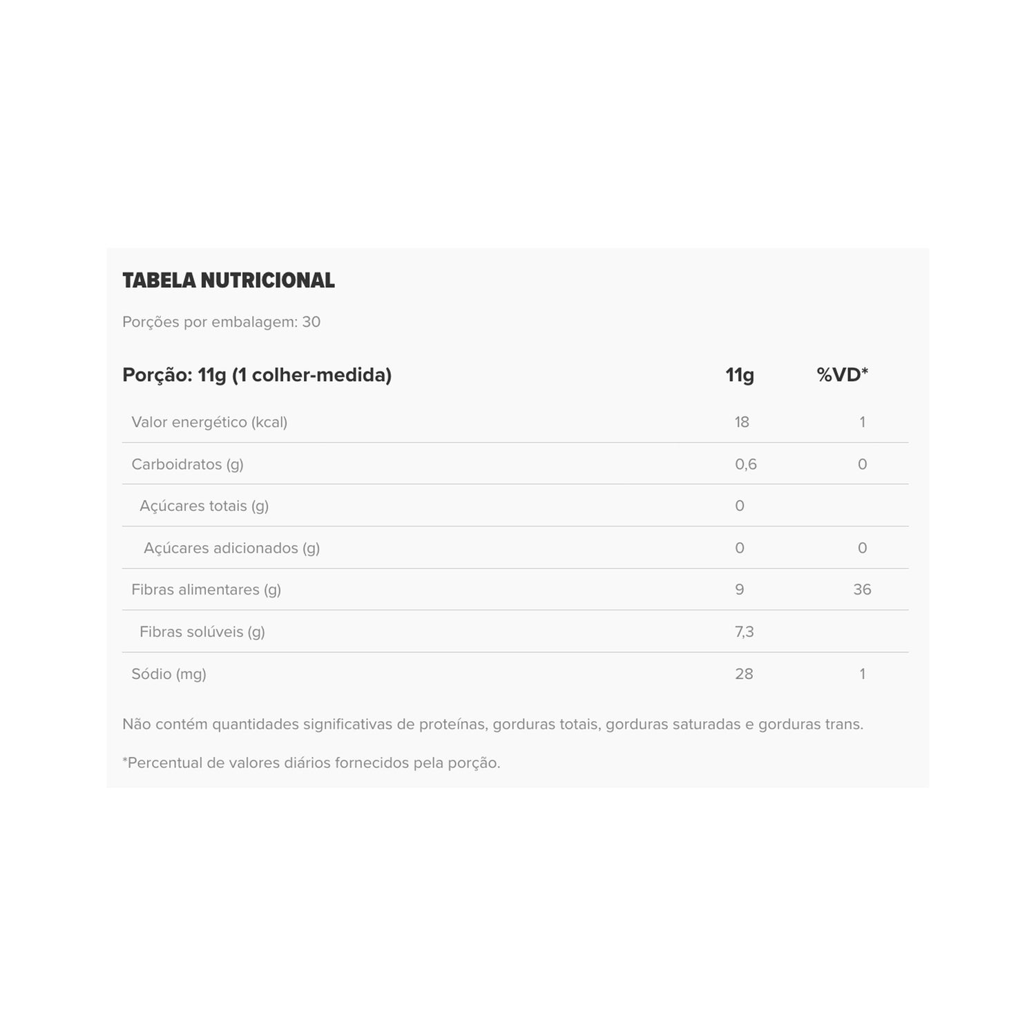 Fibra solúvel resistente de milho, goma acácia, celulose microcristalina, psyllium e aroma natural.