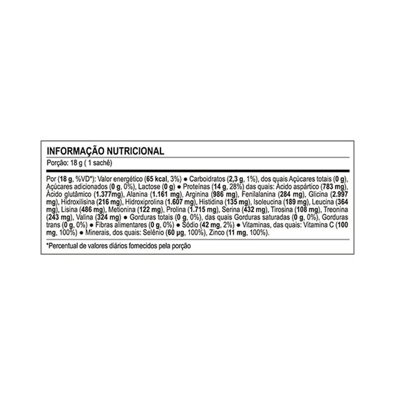Colágeno hidrolisado, laranja em pó, ascorbato de sódio (vitamina C), sulfato de zinco monoidratado (zinco), selenito de sódio (selênio), aromas naturais, acidulante ácido cítrico, edulcorante glicosídeos de esteviol, antiumectante dióxido de silício e corante urucum.